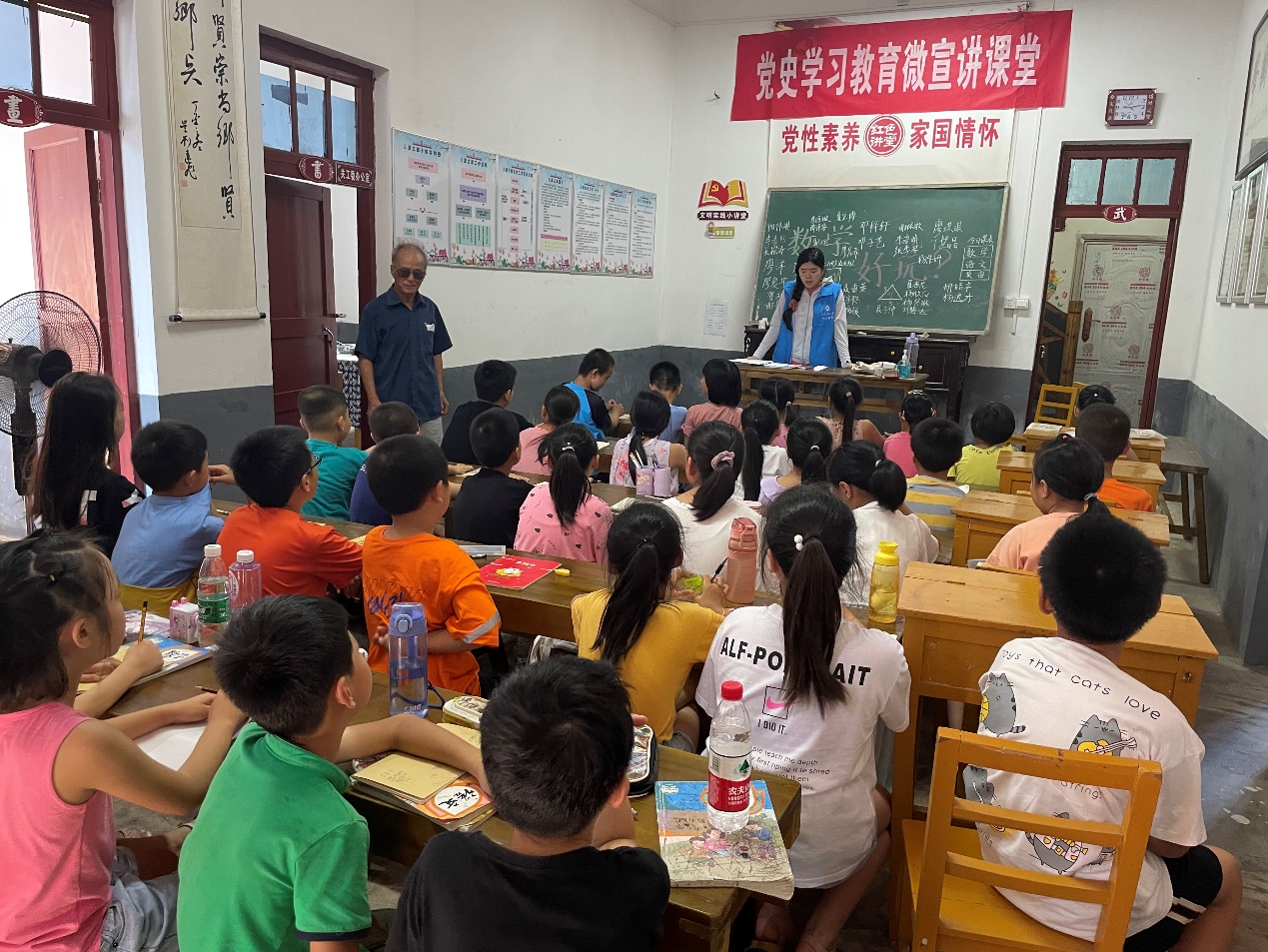 湖南科技大学人文学院退休的知名“赤脚教授”夏昭炎及其老伴杨莲金老师前往各个教室,为准备上课的志愿者提出教学建议,并在教室内等待留守儿童们的到来。“咻——咻——”随着口哨声吹响,第一节课正式开始,各教室传出一阵阵琅琅书声。