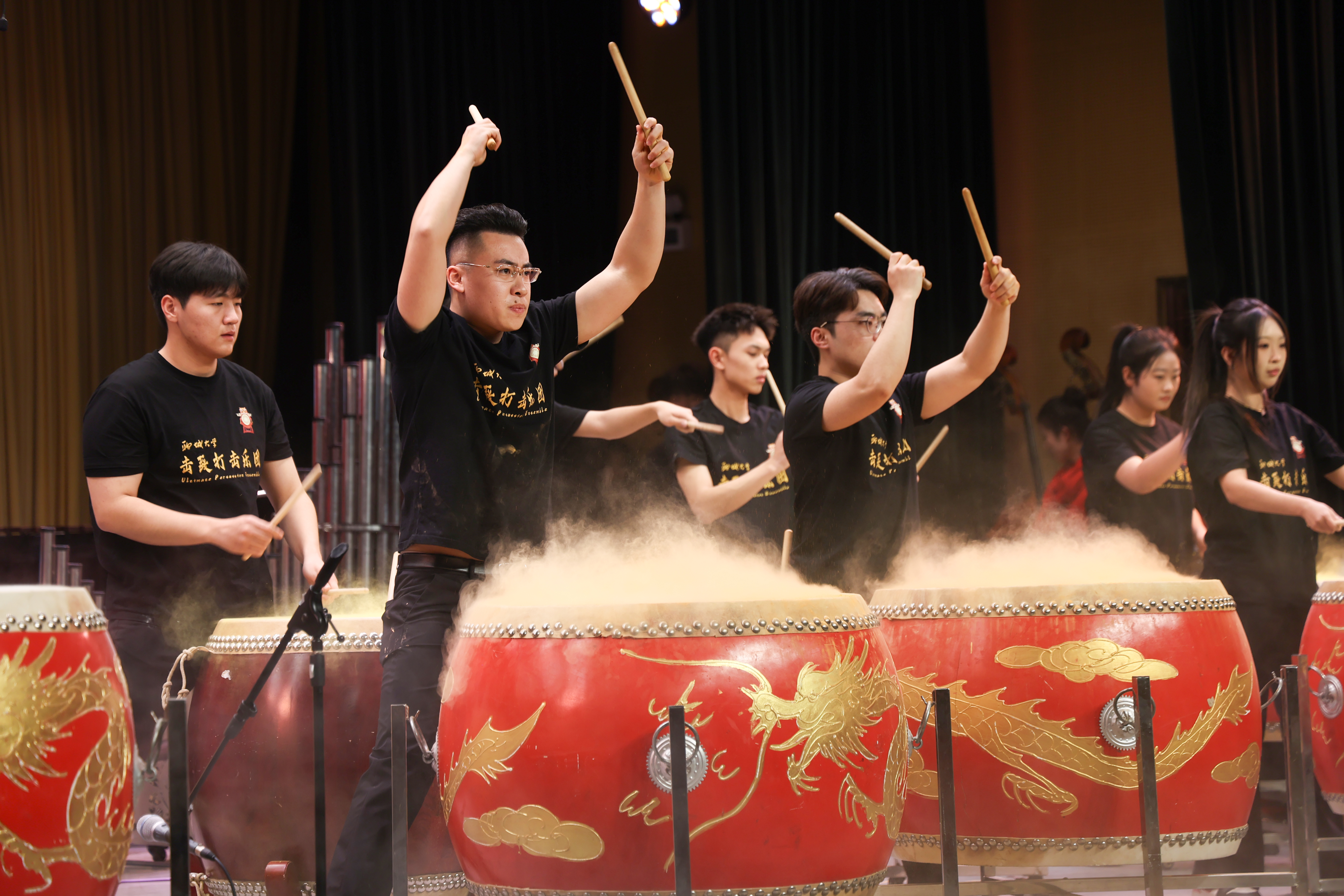《竹笛协奏曲》《古筝协奏曲——“乡韵”》既展现了民族音乐的雅致韵味,也呼应了聊城大学植根两河之畔、文脉悠长的深厚底蕴,让在场师生校友在悠悠旋律中寄托对母校的深深眷恋。鼓点起落间,击致打击乐团的《牛斗虎》以传统打击乐结合现代编排,将聊城大学龙舟精神与音乐艺术相融,诠释了聊大人“齐心协力、敢为人先、同舟共济、奋发有为”的奋斗精神。