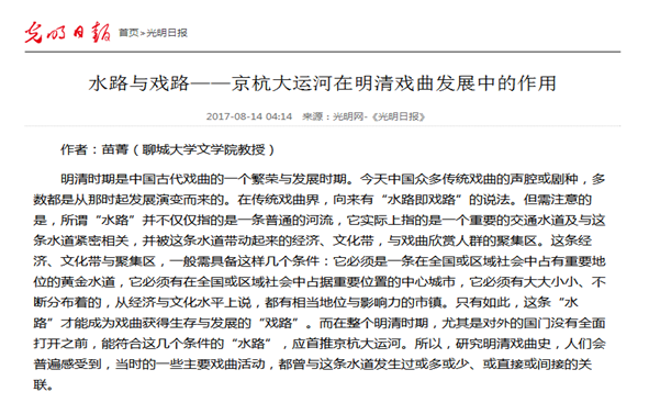【光明日报】报道文学院“京杭运河在明清戏曲发展中的作用”