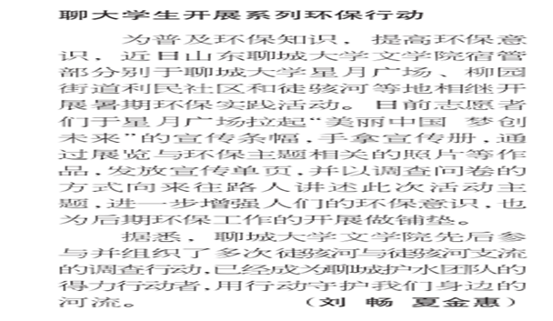 为普及环保知识,提高环保意识,7月15日起,文学院宿管部分别于聊城大学星月广场,柳园街道利民社区,徒骇河等地相继开展暑期环保实践活动。聊城大学文学院先后参与并组织了多次徒骇河与徒骇河支流的调查行动,已经成为聊城护水团队的得力行动者。
