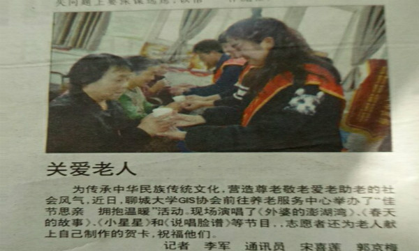 为传承中华民族传统文化,营造尊老敬老爱老助老的社会风气,近日,聊城大学GIS协会前往养老服务中心举办了“佳节思亲 拥抱温暖”活动。现场演唱了《外婆的澎湖湾)》、《春天的故事》、《小星星》和《说唱脸谱》等节目。志愿者还为老人献上自己制作的贺卡,祝福他们。