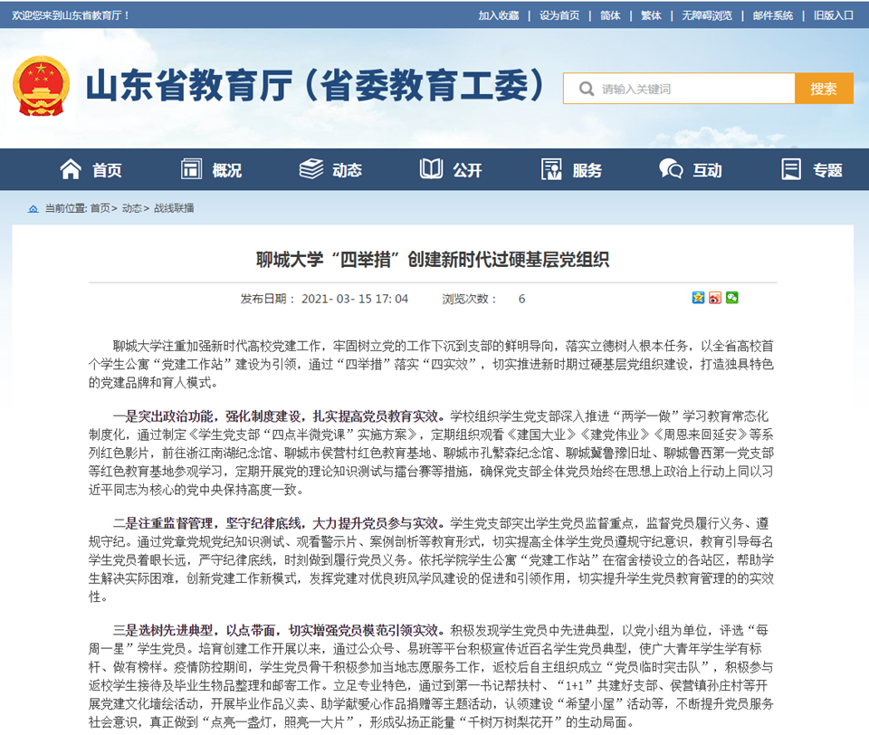 【编者按】3月15日,山东省教育厅“战线联播”栏目发布综合消息《聊城大学“四举措”创建新时代过硬基层党组织》,报道了我校高度重视新时代高校学生党建工作,依托美术与设计学院2013年创建的全省高校首个学生公寓“党建工作站”,通过突出政治功能、注重监督管理、选树先进典型、创新工作模式“四举措”,切实提高学生党员教育实效、党员参与实效、党员引领实效、党建育人实效的典型做法。