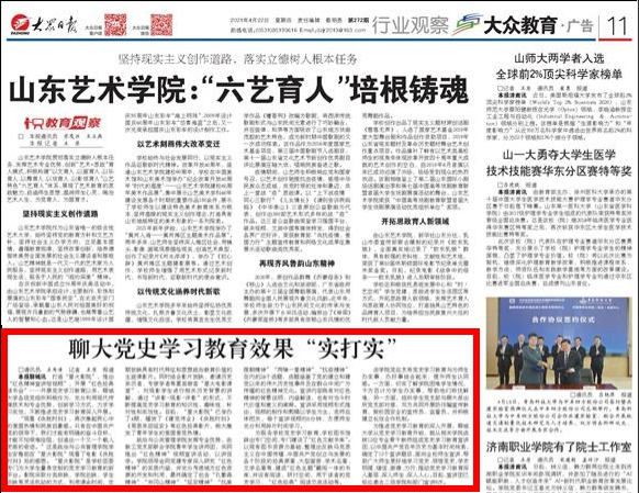 【编者按】4月22日,《大众日报》第11版“行业观察 大众教育”版面以《聊大党史学习教育效果“实打实”》为题,报道了我校在党史学习教育中的先进做法。