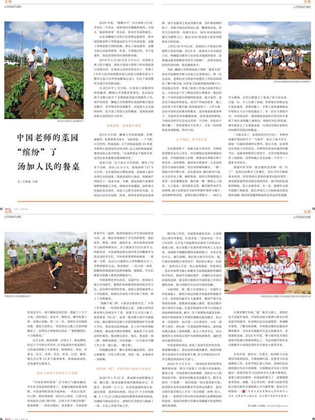 【编者按】由中国教育报刊社主办的《神州学人》杂志,在2021年第4期以《中国老师的菜园“缤纷”了汤加人民的餐桌》为题,报道了我校7名教师在汤加王国克服重重困难,积极做好援外支教工作的事迹。