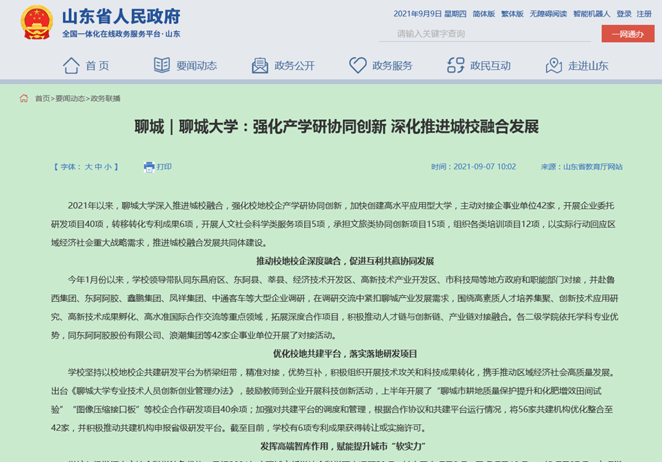 【编者按】9月7日,山东省人民政府官方网站“政务联播”栏目转发我校在山东省教育厅网站发布的综合消息《聊城大学:强化产学研协同创新 深化推进城校融合发展 》。该消息报道了我校近一年来强化校地校企产学研协同创新,加快创建高水平应用型大学,以实际行动回应区域经济社会重大战略需求,推进城校融合发展共同体建设的典型经验。