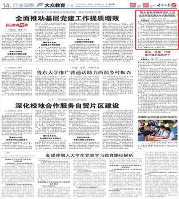 【编者按】9月23日,《大众日报》第14版“行业观察 大众教育”版面以《聊大畜牧学教师团队入选“山东省高校黄大年式教师团队”》为题,报道了我校农学院“畜牧学教师团队”入选“山东省高校黄大年式教师团队”的喜讯。
