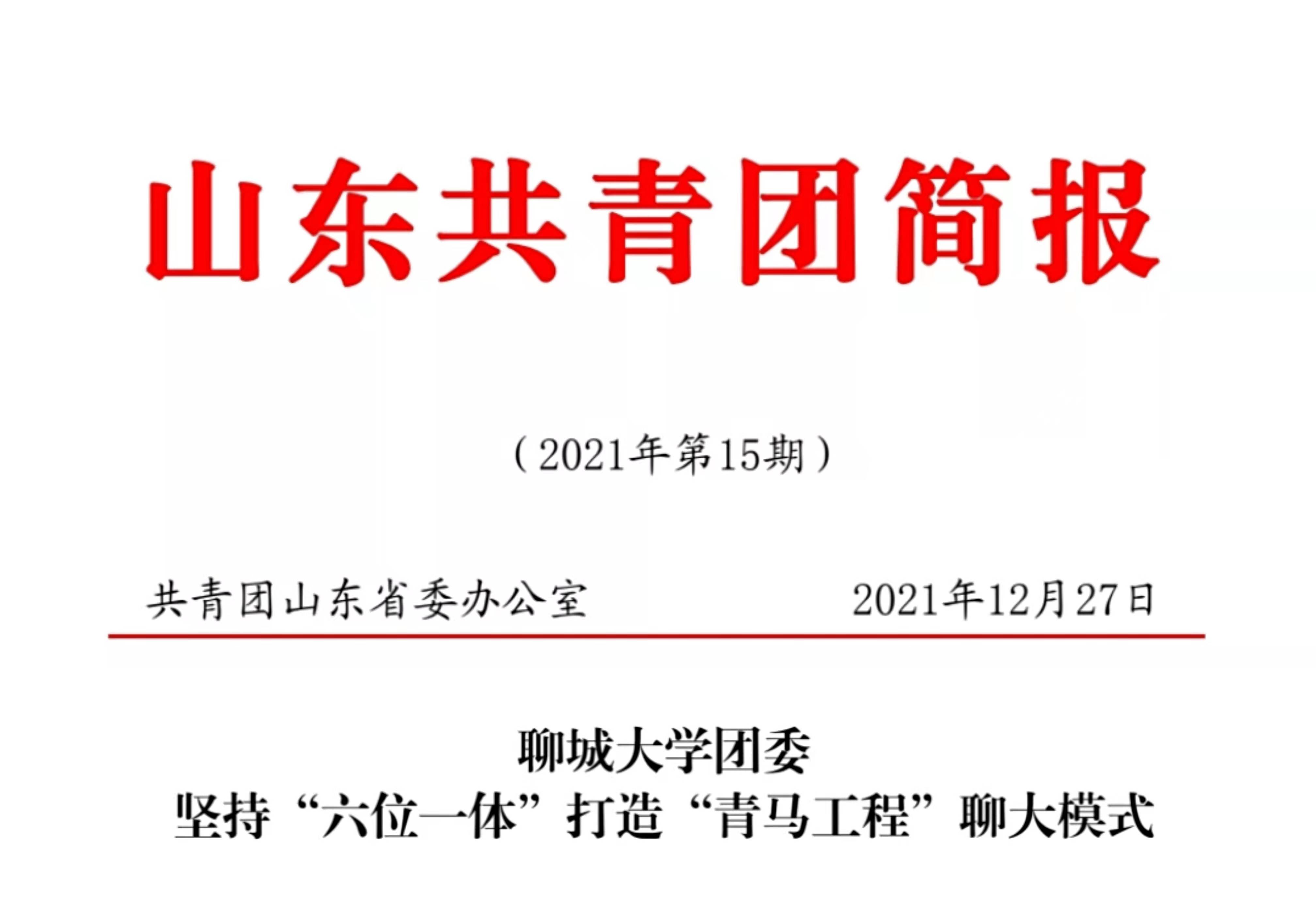 【编者按】12月27日,山东共青团简报以《聊城大学团委坚持“六位一体”打造“青马工程”聊大模式》为题,刊发了我校不断深化青年马克思主义者培养工程,创新构建理论学习、红色教育、实践锻炼、志愿服务、业务提升、学习交流相结合的“六位一体”培养模式的经验做法。