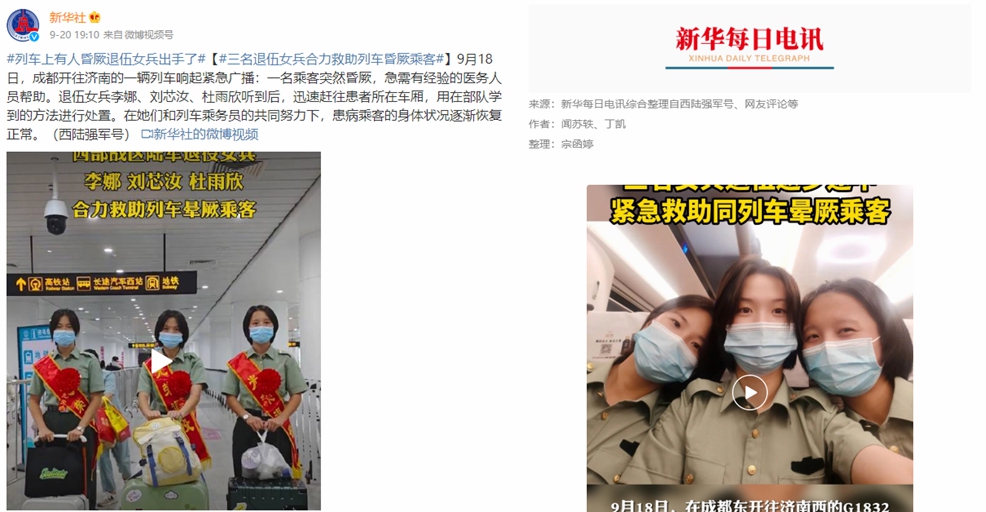 9月20日,新华社微博、新华每日电讯微信公众号、中央人民广播电台、人民日报客户端等央媒报道了退役女兵在返乡途中的高铁列车上救治病人的消息。我校党委宣传部及时发动校内媒体和省内媒体开展深度报道,把“聊城大学学子杜雨欣”作为新闻报道的关键词进行第二波正向报道,形成了良好的舆论氛围。