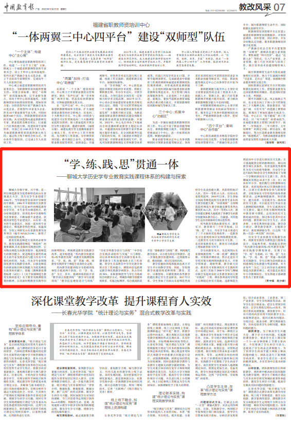 【编者按】12月21日,《中国教育报》第7版以“‘学、练、践、思’贯通一体——聊城大学历史学专业教育实践课程体系的构建与探索”为题,报道了我校历史文化与旅游学院积极推进教育实践教学改革,逐步构建起“校内教学技能训练+校外教育实践”的教育实践课程体系,“学、练、践、思”贯通一体,将教育实践贯穿于师范生培养全过程的典型经验。