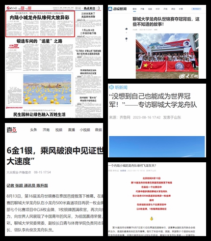 【编者按】8月7日至13日,国际龙舟联合会第 16 届世界龙舟锦标赛在泰国芭提雅举行,我校27名在校大学生组成的“高校龙舟队”大放异彩,分别在U24组别全部7个项目中夺下6金1银。《大众日报(要闻版)》《大众日报(客户端)》《海报新闻(客户端)》齐鲁网、大众网聊城、聊城市新闻传媒中心等多家媒体纷纷对我校龙舟队取得的优异成绩、我校为载誉归来的龙舟队庆功、学习党委召开学习龙舟队精神研讨会等进行了相关报道。《大众日报(要闻版)》以《一个内陆小城的龙舟队缘何飞龙在天?》为题,对龙舟队夺冠背后的故事进行了深入报道,充分展现了我校龙舟精神和龙舟文化。