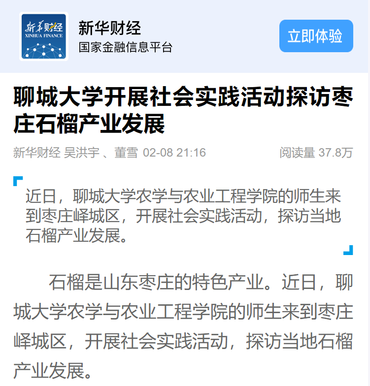 【编者按】2月8日,新华财经以《聊城大学开展社会实践活动探访枣庄石榴产业发展》为题,报道了我校农学与农业工程学院寒假期间深入枣庄地区,开展社会实践,支持石榴产业发展的做法。