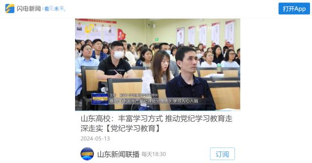【编者按】5月13日,【山东新闻联播】【山东卫视】【闪电新闻】以《山东高校:丰富学习形式 推动党纪学习教育走深走实》为题,报道山东高校开展党纪学习教育情况,视频两分十六秒报道我校开展党纪学习教育做法。
