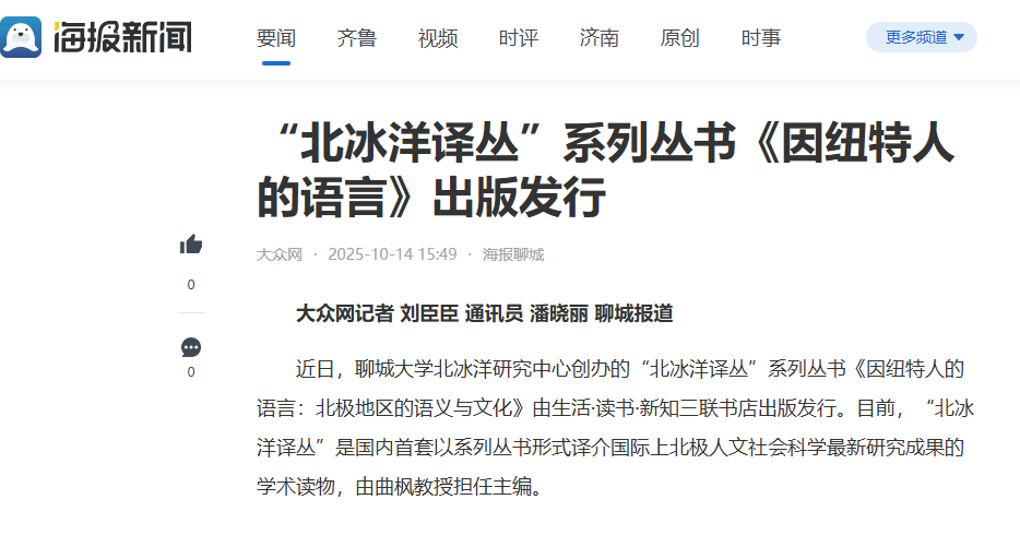【海报新闻】【今日头条】报道“北冰洋译丛”系列丛书《因纽特人的语言》出版发行
