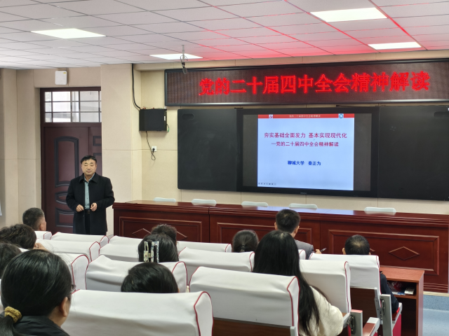 宣讲报告中,秦正为教授以《夯实基础全面发力,基本实现现代化——党的二十届四中全会精神解读》为题,紧紧围绕习近平总书记重要讲话精神和全会部署要求,系统阐释了全会的重大意义、精神实质和丰富内涵。他提到,党的二十届四中全会的召开恰逢“十四五”规划圆满收官、“十五五”规划即将开启的关键节点,会议取得的重大成果、作出的重大部署,对今后一个时期党和国家事业发展具有里程碑意义。秦教授的讲解逻辑清晰、史料翔实、论述精辟,既有理论高度,又有思想深度,整场报告会气氛热烈,学习氛围浓厚。